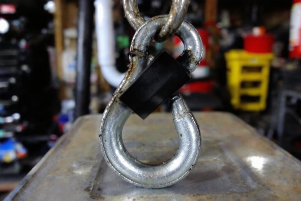Deux crochets métalliques entrelacés sur surface industrielle