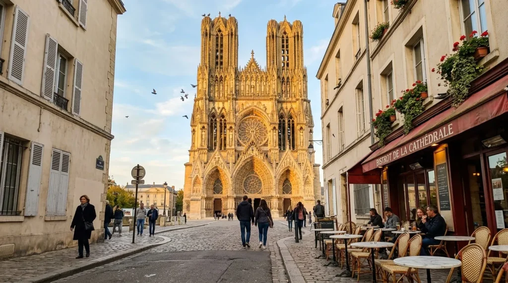 L’ange au sourire, cette sculpture emblématique nichée sur la façade, est devenue le symbole affectif de toute la ville. Depuis le sommet des deux tours, la vue embrasse les toits de Reims et les coteaux environnants dans un panorama saisissant.